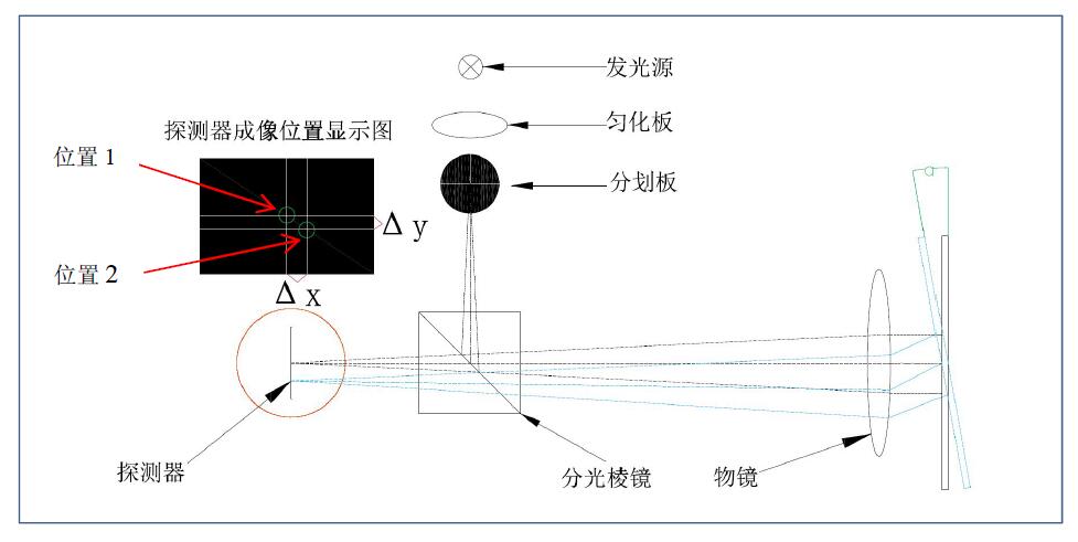 其工作原理如上图图。由光源发出的光经过匀化板之后,照亮位于物镜焦平面上的分划板,从分划板上发出的光经物镜后即形成平行光,平行光被垂直于光轴的反射镜反射来,可汇聚与 分划板的共轭焦平面的探测器成像面上位置 1,在此点设置一绝对参考点。(黑色虚线部分为光线 发出及反射汇聚图)。当反射镜倾斜一个微小角度 a 时,反射回来的光束就会倾斜 2a 角度。再次 经过物镜汇聚到探测器的位置 2 上(蓝色虚线部分为光线反射汇聚图)。此时在探测器会根据与原 设置参考点的位置算出两个方向的的偏移量Δx、Δy。